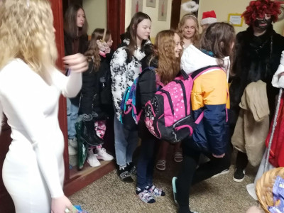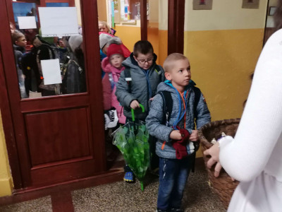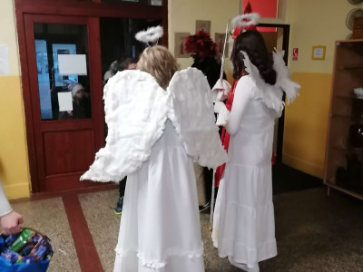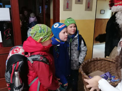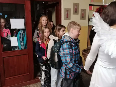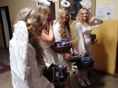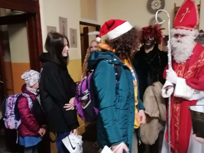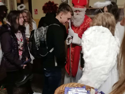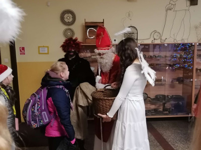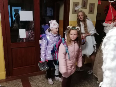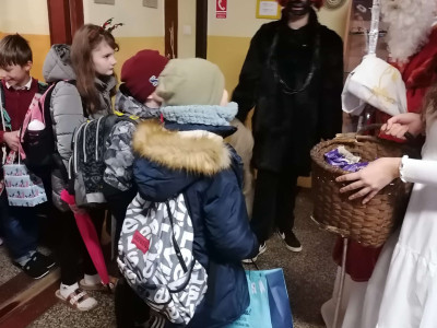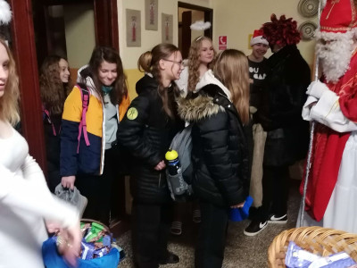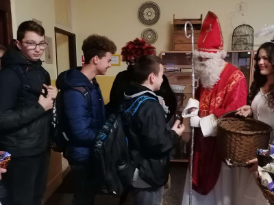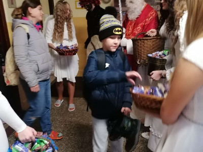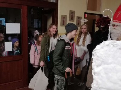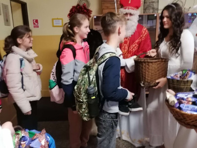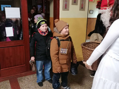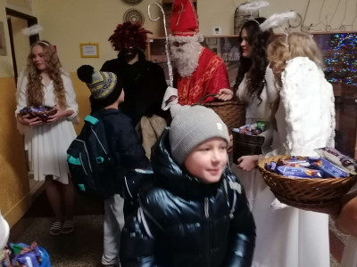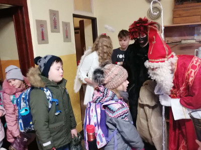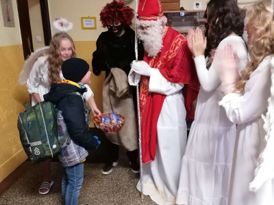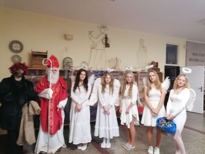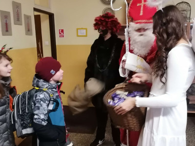 Aj túto básničku od smelej prváčky si vypočul svätý Mikuláš v utorok ráno 6.decembra 2022, ktorý sa trpezlivo a so záujmom prihováral deťom pri vchode do budovy našej vianočne vyzdobenej školy. O vytvorenie radostnej mikulášskej atmosféry sa ochotne postarali naši deviataci: Mikuláša excelentne predviedol Tobias, na nepoznanie zamaskovaného čerta s vrecom stvárnil Matej. V krásnych bielych kostýmoch sa predstavili ako anjeli, rozdávajúci medovníčky, šarmantné dievčatá Nelka, Romanka, Kristínka, Simonka a Henrietka. Ďakujeme, svätý Mikuláš, o rok čakáme ťa zas….