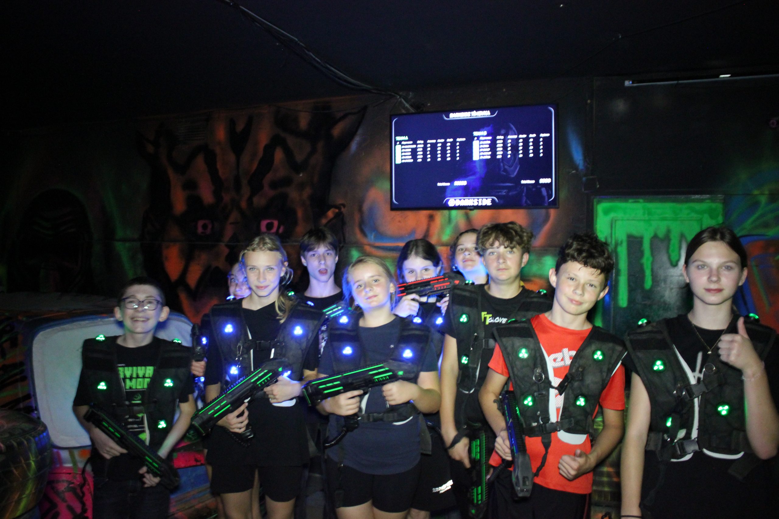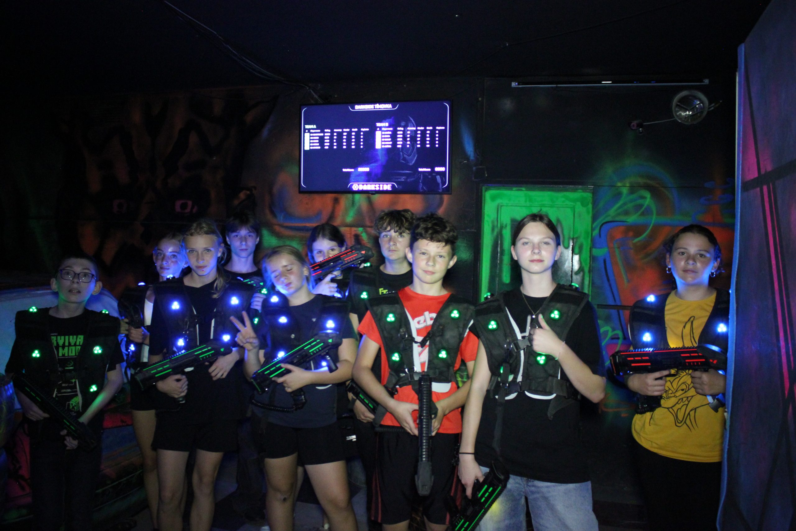 Pri vstupe sme dostali vesty, laserové zbrane a vyzerali sme ako skutoční vesmírni bojovníci! 🚀✨Schovávali sme sa, strieľali, behali a smiali sa. Tímovo sme bojovali ako superhrdinovia. 🦸‍♂️🦸‍♀️