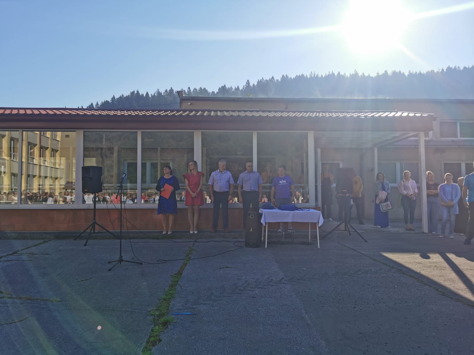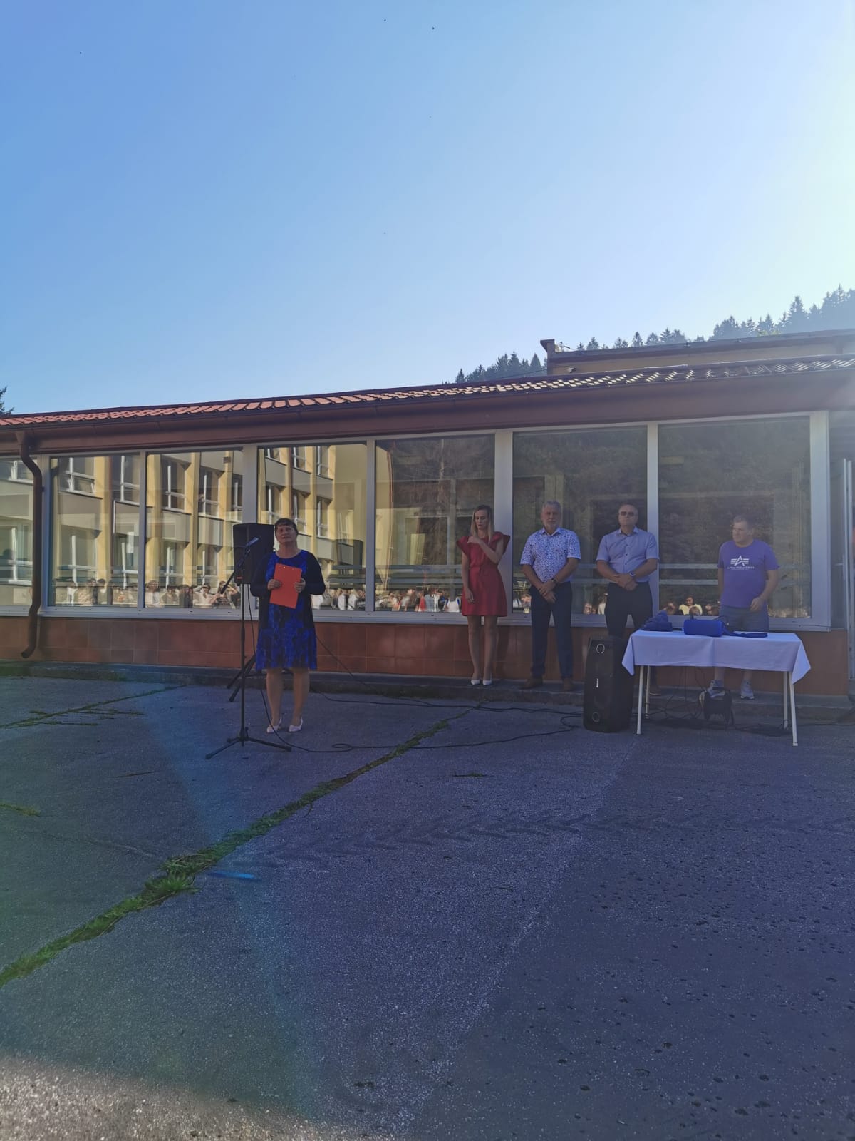 Slávnostné otvorenie nového školského roka pokračovalo na školskom dvore, kde pani riaditeľka Majka Šimuláková spolu so starostom Dlhého Poľa pánom Tiborom Gajdošíkom privítali všetkých zamestnancov, žiakov, osobitne prvákov. Popriali im veľa úspechov a radosti z každého dňa, ktorý strávia v škole.