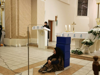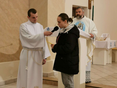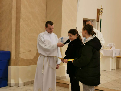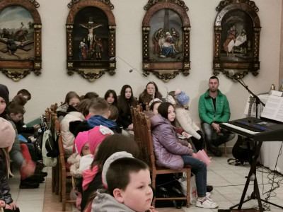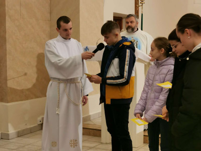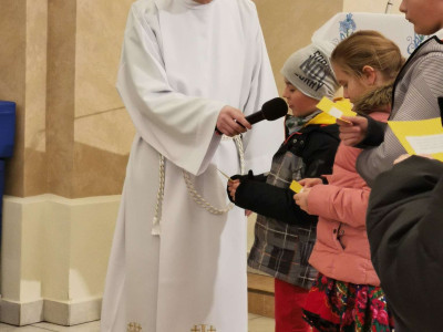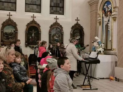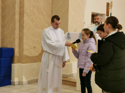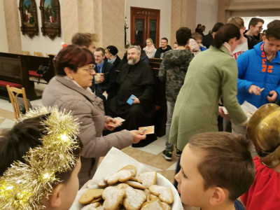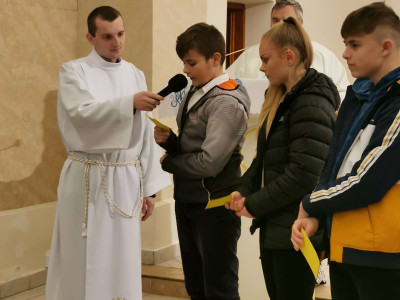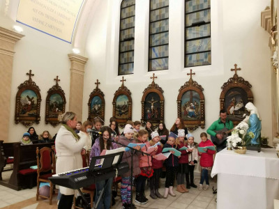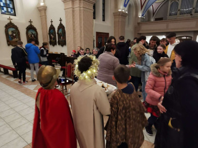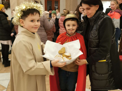 Po svätej omši bola možnosť pozrieť si prezentáciu o živote Martina z Tours. Príhodu stretnutia vojaka Martina so žobrákom umelecky stvárnili tretiaci Adamko, Jakubko a Nikolasko v scénke, ktorú si pripravili a aj kostýmovo výborne predviedli pod vedením p.uč. Mgr.Evky Letkovej. Na záver boli účinkujúci i ostatné prítomné deti obdarované obrázkami sv. Martina s modlitbou a medovníčkami od Mgr. art. Zuzky Štachurovej, ktorá hudobne sprevádzala celú akciu so svojím detským speváckym zborom.