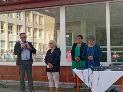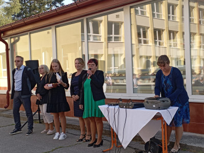 Slávnostné otvorenie pokračovalo na školskom dvore o 8:30 hodine. Žiaci, ktorí boli prítomní v kostole, sa presunuli do školy na školský dvor pod dozorom prítomných učiteľov alebo svojich rodičov. Po skončení programu, na ktorom sme privítali aj našich prvákov, nových žiakov i nové dve pani učiteľky, sa odchádzalo do tried. Neodmysliteľnou súčasťou bol príhovor našej pani riaditeľky, pani starostky za obec Dlhé Pole a pána starostu zo Svederníka.