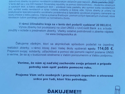 Dňa 23. septembra sa žiaci našej školy zapojili do celoslovenskej verejnej dobročinnej zbierky na pomoc nevidiacim a slabozrakým občanom pod názvom „Biela pastelka 2022“. Biela pastelka je symbol sveta neviditeľných línií, symbol sveta nevidiacich a výraz ľudskej solidarity a dobrej vôle. Výnos celoslovenskej zbierky je určený na poskytovanie poradenstva a výcvikových programov, ktoré nevidiacim ľuďom pomáhajú priblížiť sa normálnemu životu.