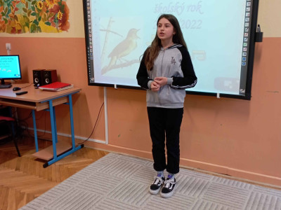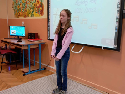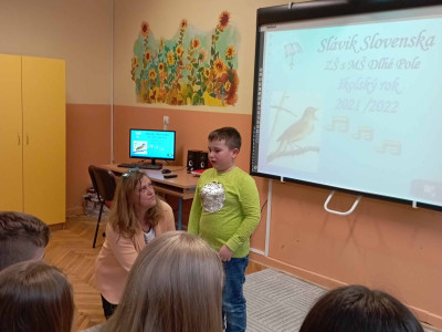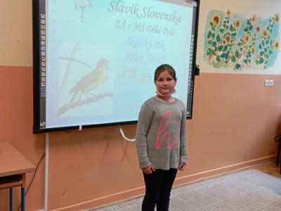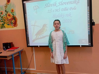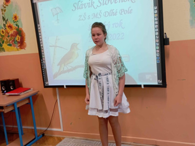 Dňa 5.4.2022 sa na našej škole uskutočnila speváčka súťaž ,,Slávik Slovenska 2022″. Žiaci súťažili v troch kategóriách. Výsledky súťaže: v prvej kategórii dve 2.miesta získali žiačky 3.A triedy – Agáta Špecíková a Júlia Majerčáková. 3. miesto – Jozef Fizík, žiak 2.B triedy. V druhej kategórii – 1.miesto získala – Olívia Štachurová, žiačka 5.A triedy, 2.miesto – Agáta Delinová, žiačka 5.A triedy, 3.miesto – Dávid Škorčík, žiak 6.A triedy. V tretej kategórii 1. miesto získala Kristína Pavelčíková, žiačka 8.A triedy, 2. miesto – Rút Štachurová, žiačka 7.A triedy, 3.miesto – Eliáš Špeciál, žiak 7.A triedy.